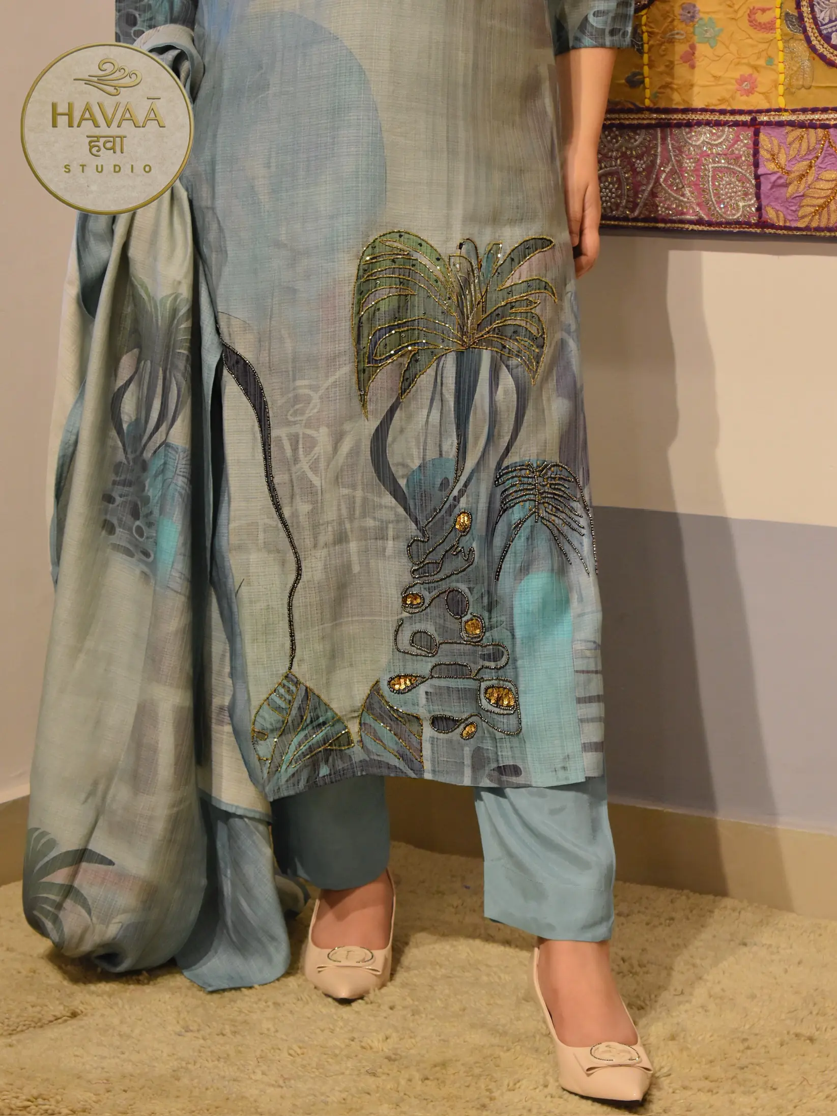 This blue digital print suit set features a beautifully printed kurta crafted in self-textured fabric, highlighted with delicate handwork using sequins and cutdana detailing. The V neckline is enhanced with subtle hand embroidery that adds just the right amount of festive charm while keeping the outfit refined and wearable.