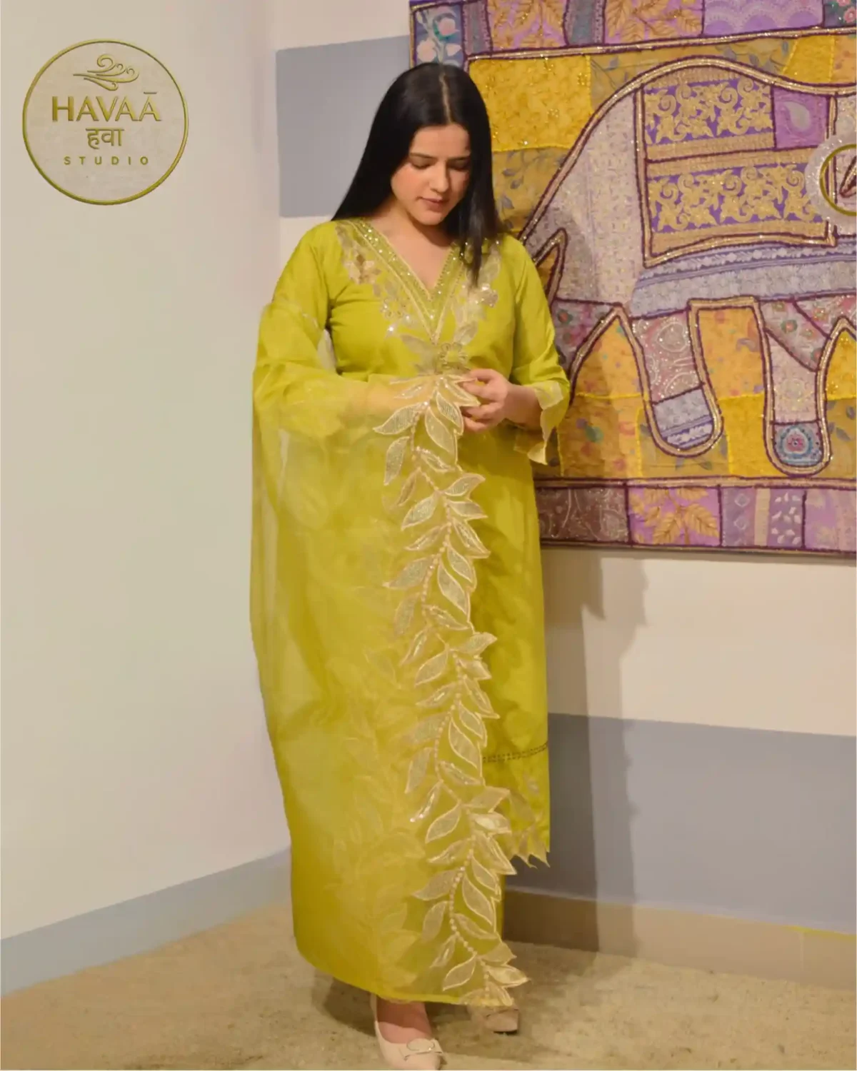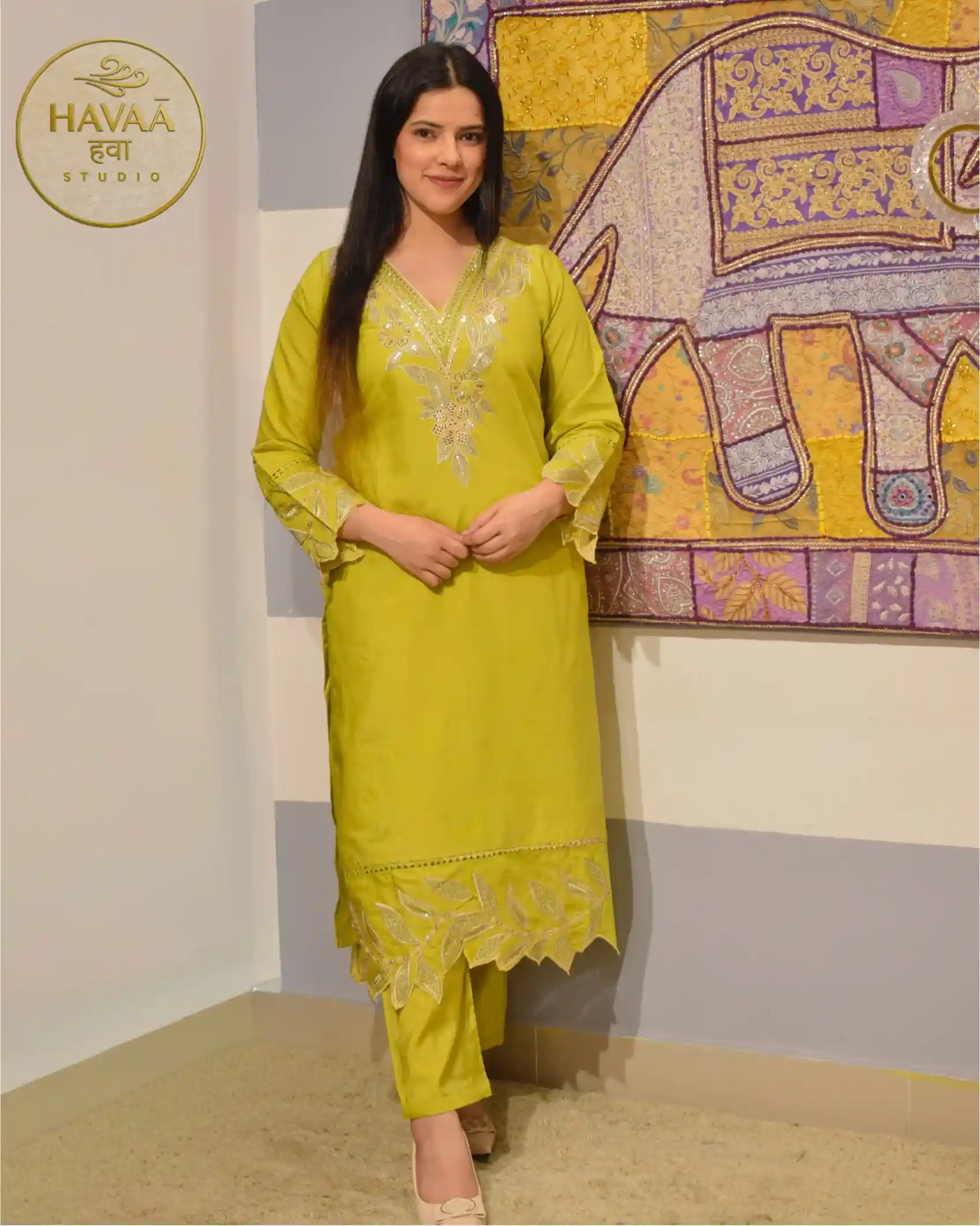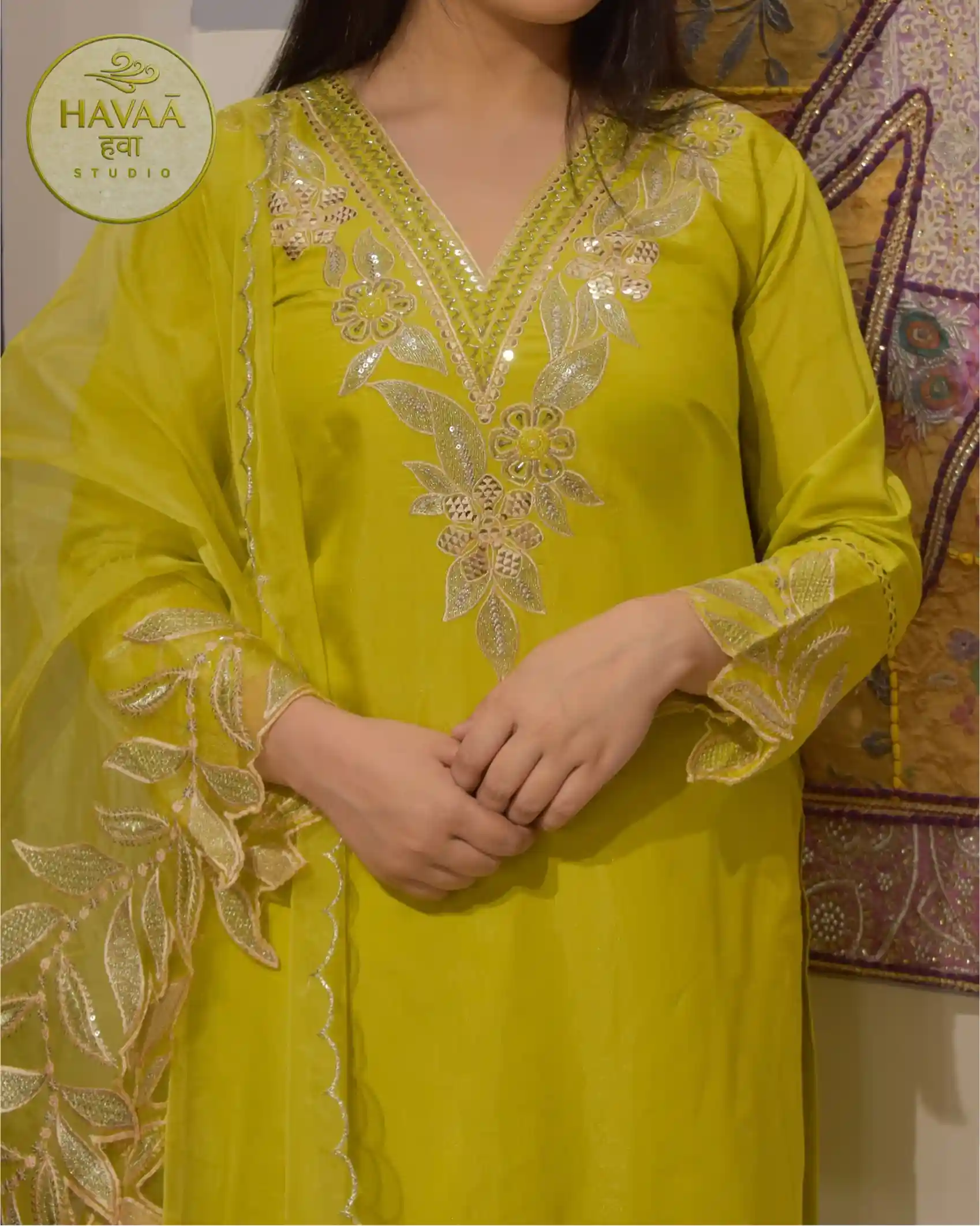 This lime green straight suit showcases intricate leaf cutwork detailing along the hem and sleeves. It is complemented by a statement dupatta featuring delicate leafy cutwork on one longer side and a refined scalloped border on the other edge. The refreshing colour makes it an ideal choice for haldi ceremonies, festive celebrations, summer weddings, pooja gatherings and elegant brunch parties.