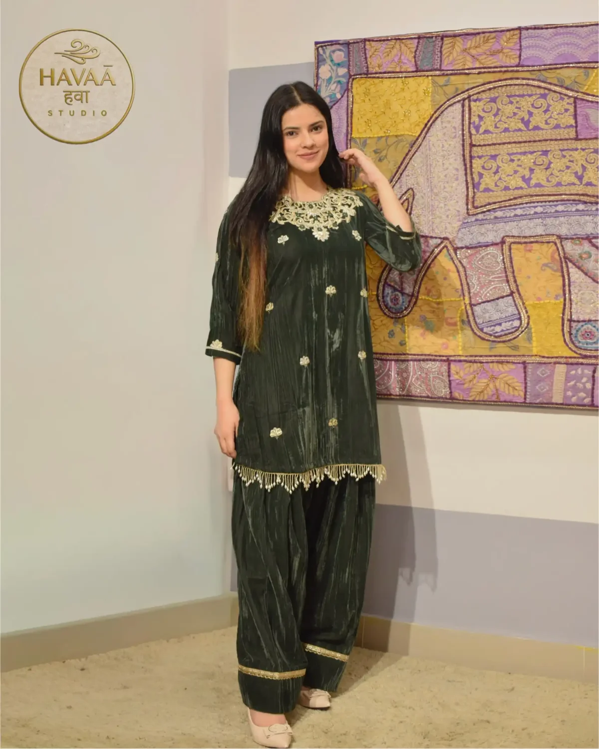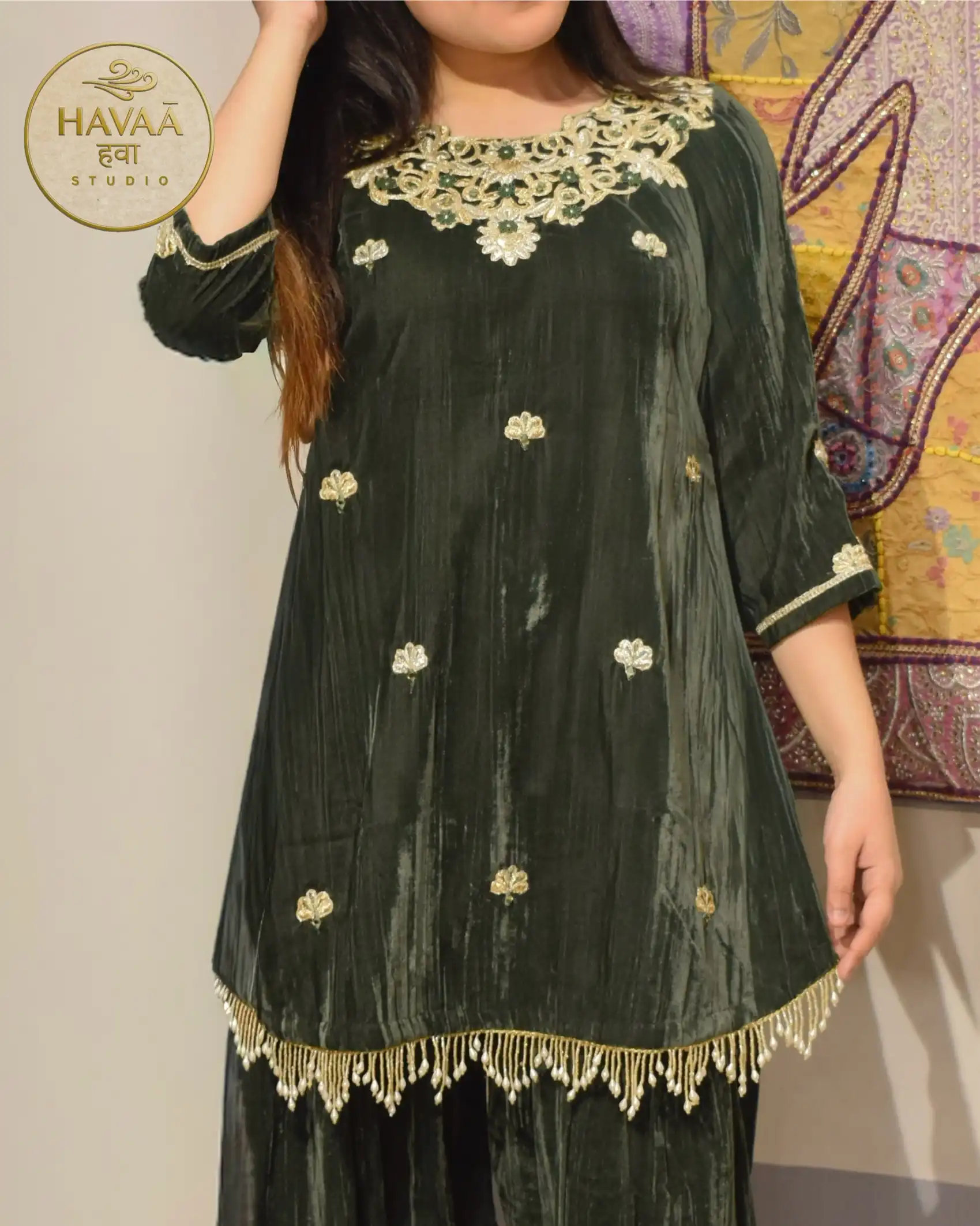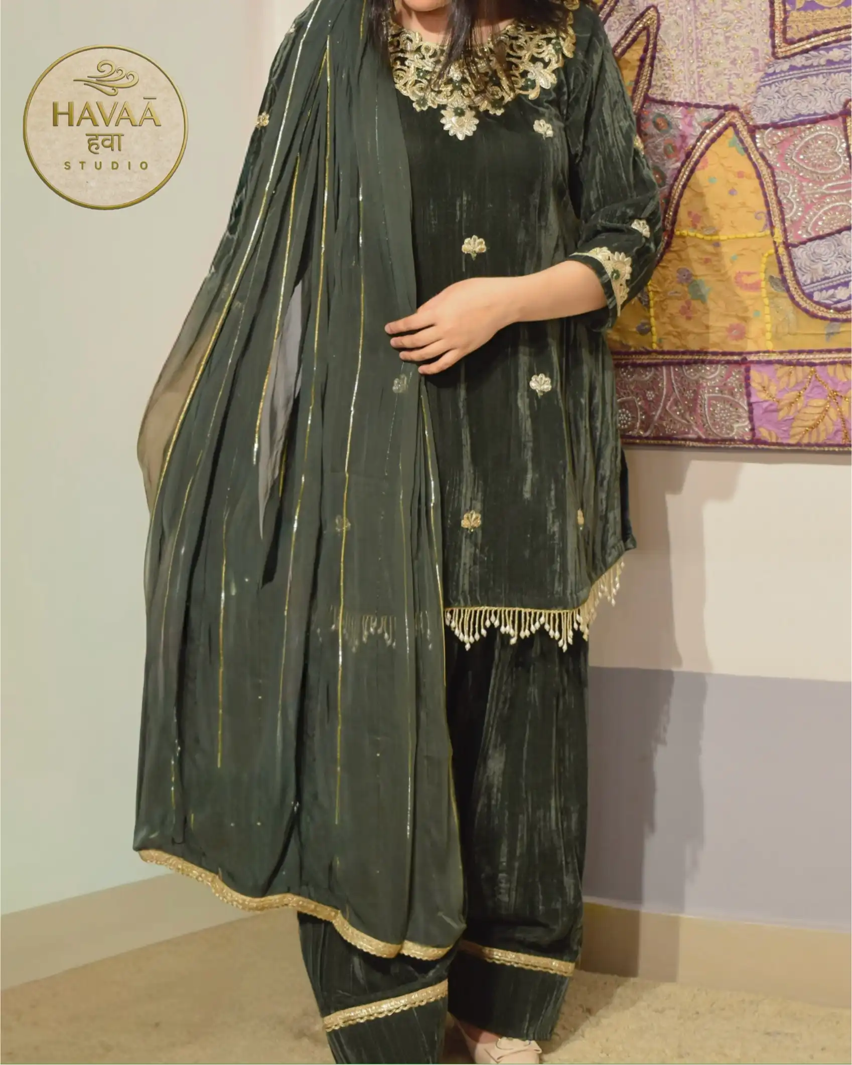 Regal, festive and statement-making. This olive green crushed velvet farshi salwar suit is crafted for wedding functions and grand festive gatherings.
