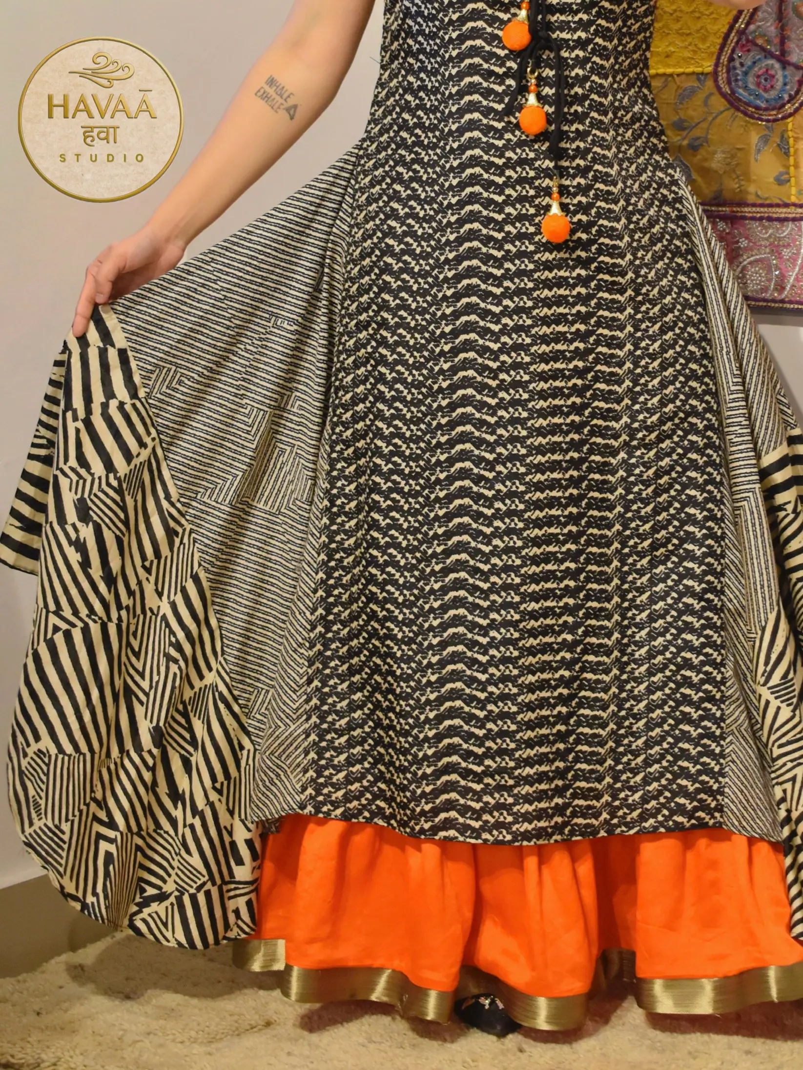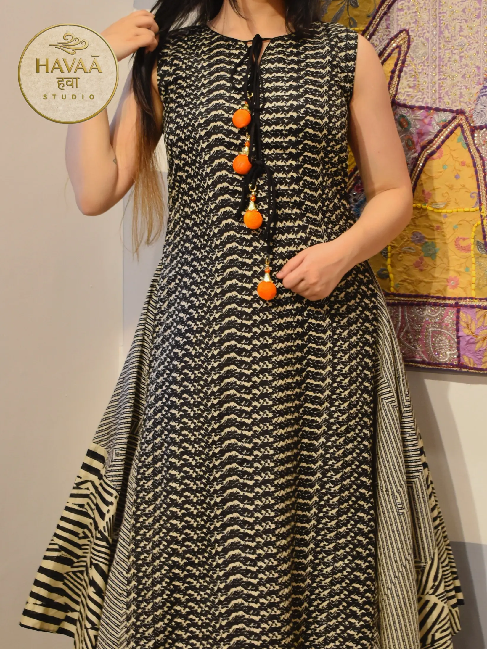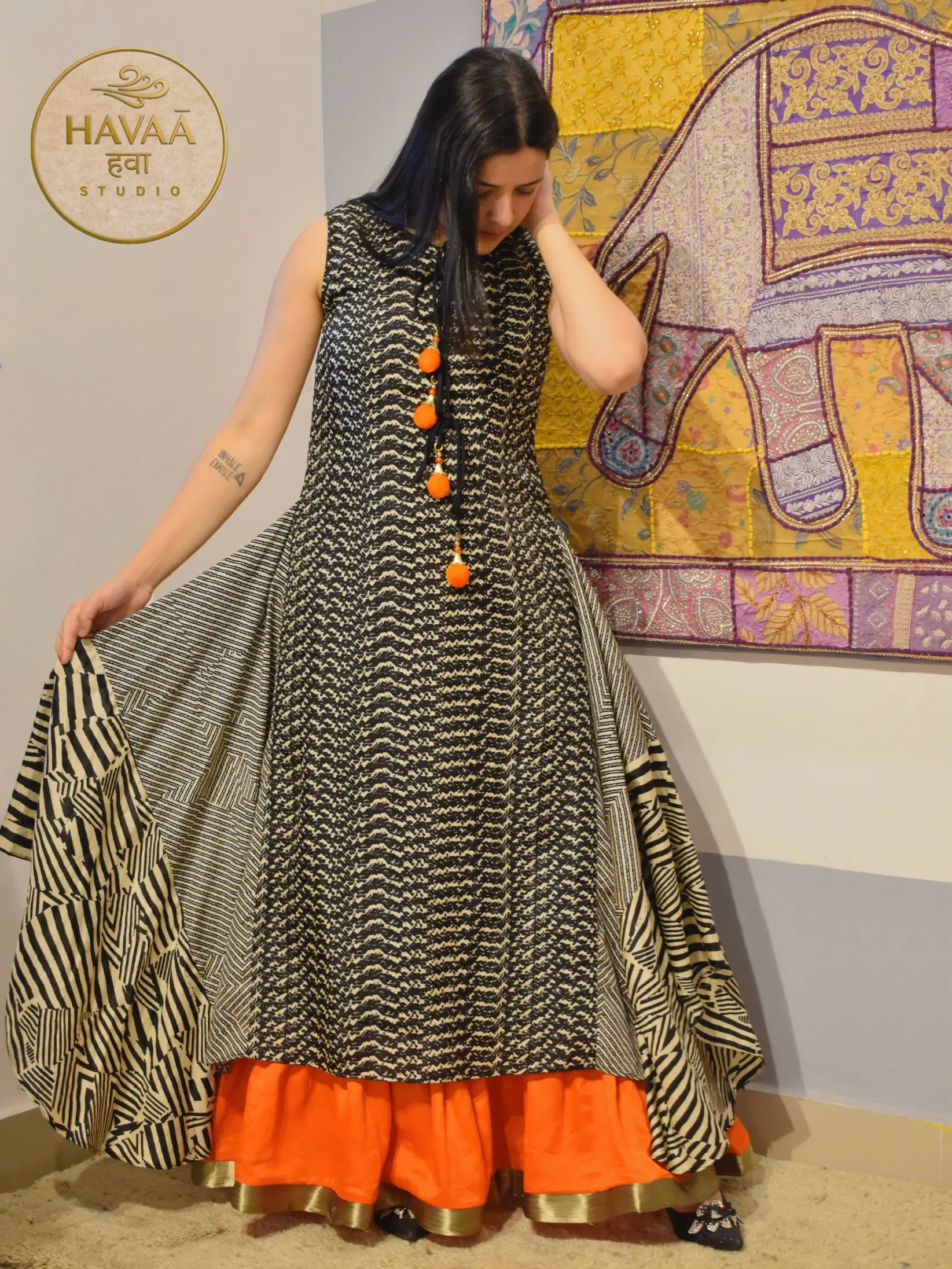 This black Indo-western designer gown dress features a unique 3-layer silhouette with attached side panels that create a flowing, statement look. The layered design adds volume and movement, making it perfect for festive occasions, cocktail parties, wedding functions and modern ethnic celebrations.