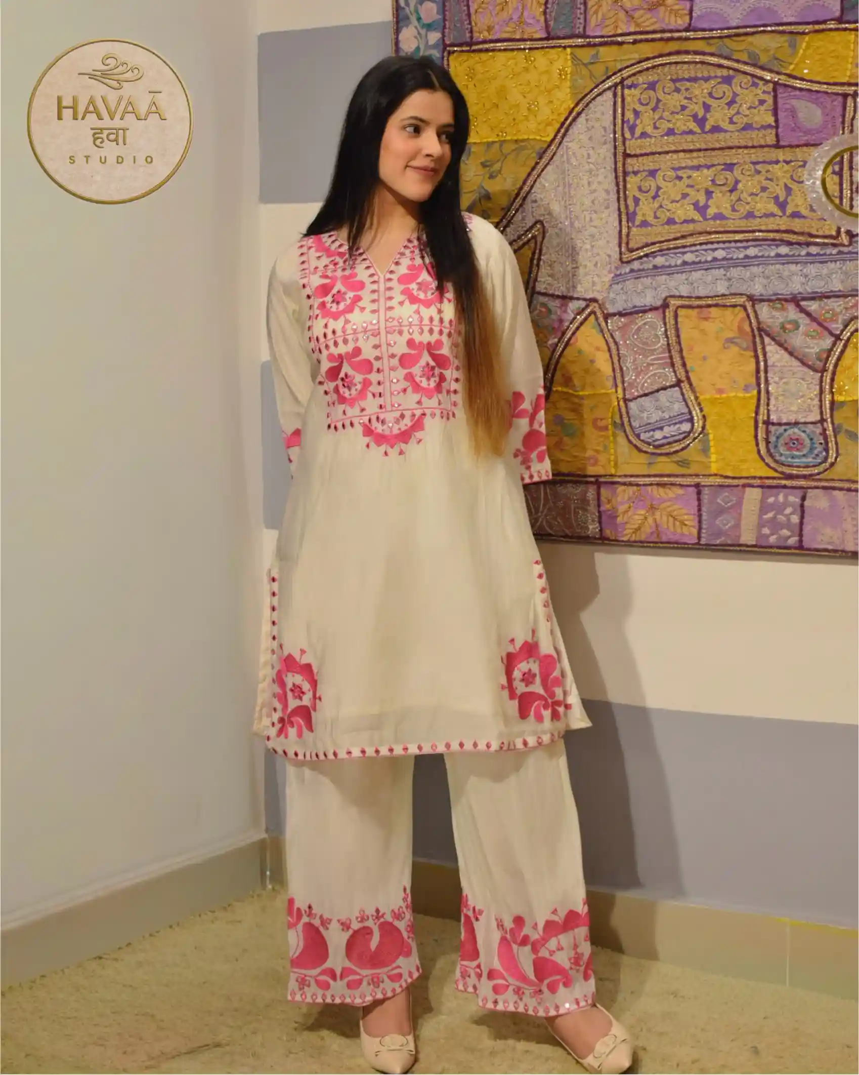 The off-white kurta is adorned with heavy pink floral appliqué work, carefully layered to create dimension and texture. Delicate mirror imitation detailing is intricately placed within the floral motifs, adding a subtle festive shimmer while maintaining a refined aesthetic. Very soft pure fabric, perfect for summers.