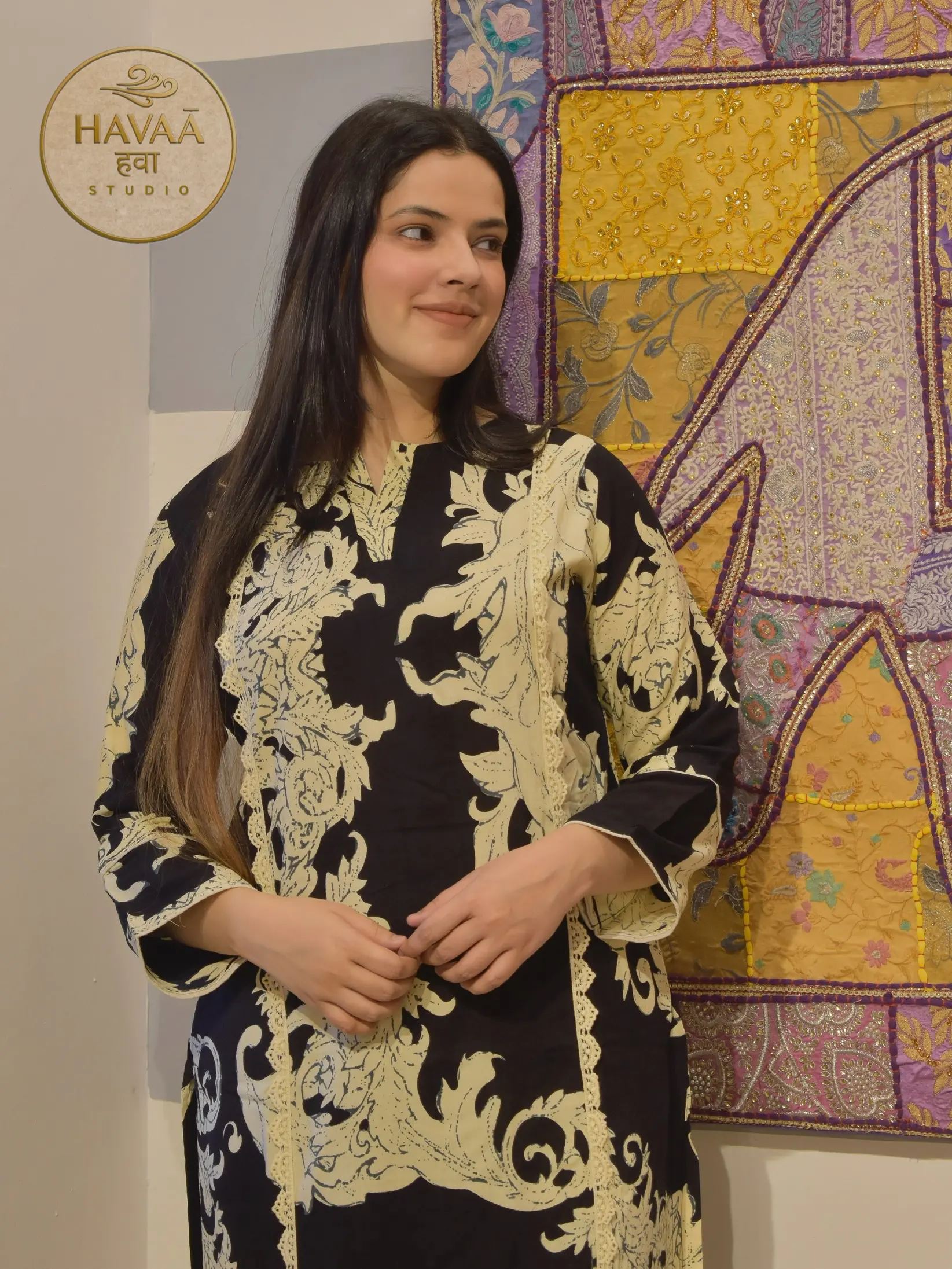 Unique, stylish and effortlessly comfortable. This dragon print cotton co-ord set features a striking black and off-white print inspired by Pakistani style silhouettes. The relaxed and flowy fit gives the outfit a graceful drape while keeping it comfortable for all-day wear.